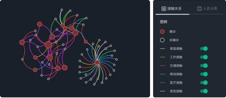 切换展示维度 可以在侧重点自身所处状态和侧重点之间的连接关系两种不同展示视角之间自由切换。在关注人员分类状态时,网络图中每个点的颜色样式由其所处状态决定,此时连线统一为白色;在关注人员之间的接触关系时,点的颜色仅根据是否确诊来区分(红色为确诊,白色为尚未确诊的密切接触者),点之间连线的颜色则根据其接触状态显示出6种不同的颜色。