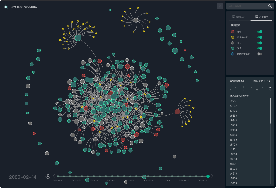 时间轴 滑动时间轴可以查看每日数据更新带来的网络图变化情况。滑动时间轴时,会有新增确诊病例,也会同步产生更多密切接触者,同时上一日的人员状态也会根据数据更新的情况进行演变。