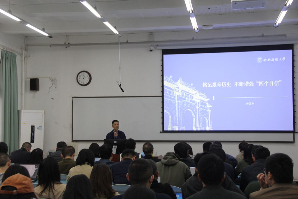 曾主任从“看宏观、看发展”、“看主流、看大势”两个基本逻辑切入主题,从学习党史、革命史、新中国史的原因出发,详细介绍了鸦片战争以来中国共产党的党史、革命史和新中国发展的历史;回顾了新中国从成立、改革开放到新时代的伟大跨越;结合推进国家治理体系和治理能力现代化这一主题,重点阐述了党的十九届四中全会精神,阐述了对中国特色社会主义制度“十三个显著优势”的理解;鼓励大家扎根中国大地,建好世界一流大学、一流学科,真正做到“四个服务”,承担好新时代西财人的时代责任。