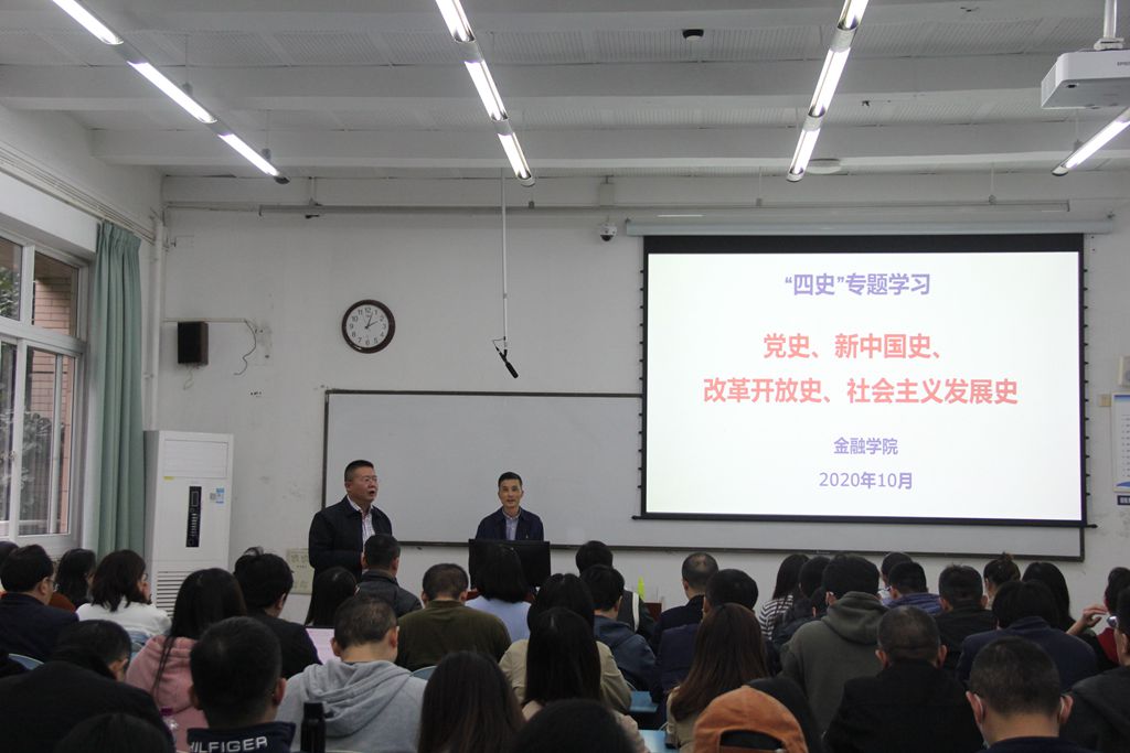 金融学院高度重视和持续深入开展“四史”学习教育。2020年10月27日,学院在H109举行“四史”学习教育。学校纪委副书记、纪检监察办公室主任曾朝夕教授受邀作《铭记艰辛历史、不断增强“四个自信”》讲座。学院全体教职工、党支部书记及学生代表参加学习。学院分党委书记李原主持学习。