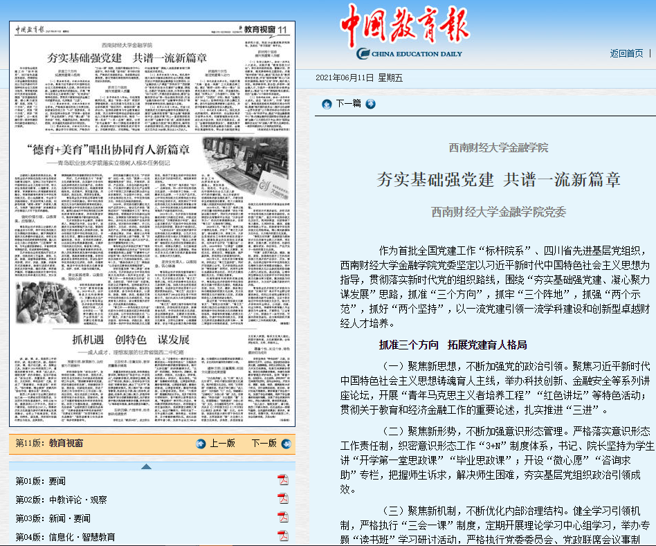 6月11日,《中国教育报》刊登了《夯实基础强党建 共谱一流新篇章》一文,报道西南财经大学金融学院以一流党建引领一流学科建设和创新型卓越财经人才培养的经验做法成效。这是继人民网、学习强国报道金融学院“2233”党建育人新模式后的又一专题报道。