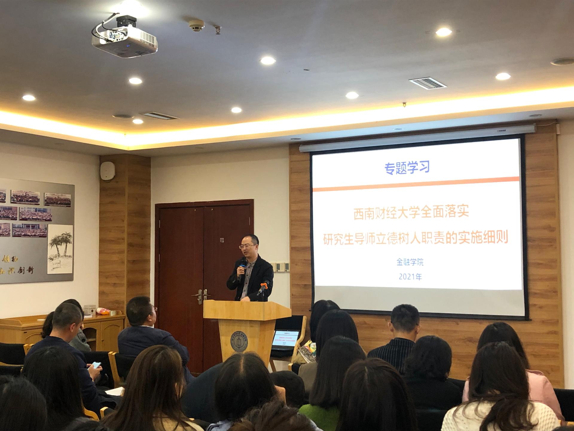 10月19日,金融学院在格致楼411会议室开展《全面落实研究生导师立德树人职责的实施细则》专题学习活动。金融学院领导及全体教师参加会议,学院副院长罗荣华主持会议。
