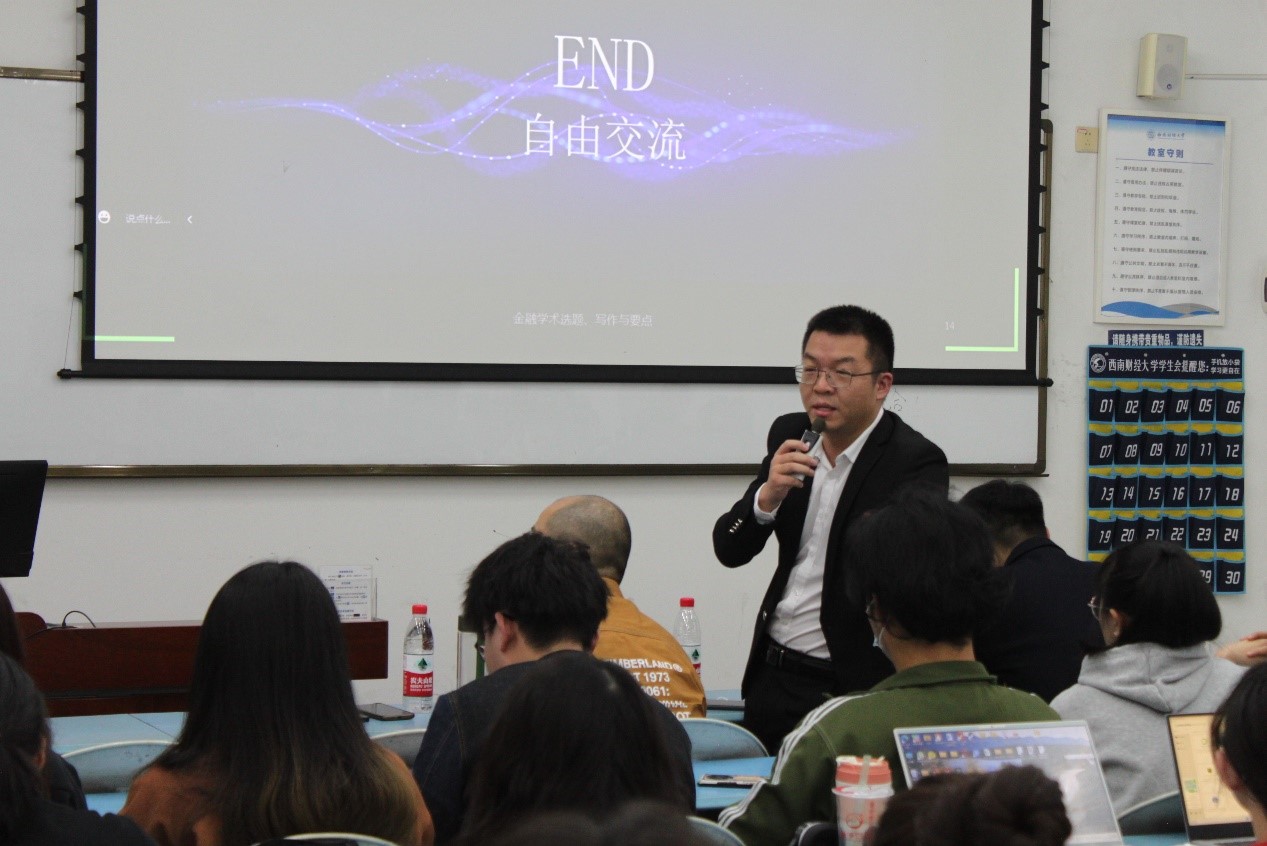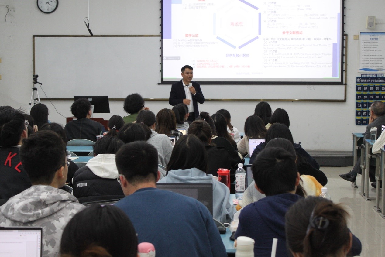 活动伊始,李映东老师向大家介绍了本次交流会的主要内容和深刻意义。随后,尹玉刚老师做主题发言,从专家评审视角向同学们传授金融学术类论文选题经验以及写作要点。尹玉刚老师首先强调了论文写作的创新性、科学性和规范性,随后就学术论文的选题和命题展开讨论,从如何选题、选题要点等多方面传授了很多经验,并就学术论文的组成要点进行分析。发言的最后,尹老师也对学术研究基础、文献查找、论文发表流程等进行了详细介绍。