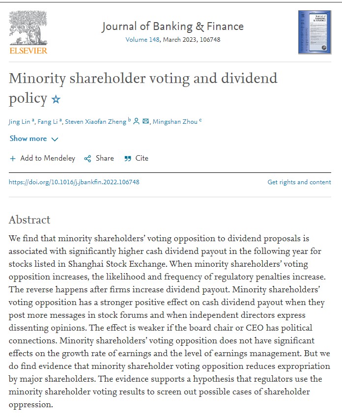 日前,金融学院林靖副教授(第一作者)与学院黎方博士、中南财经政法大学周铭山教授、加拿大University of Manitoba的Steven Zheng教授合作的论文“Minority shareholder voting and dividend policy”在国际著名经济金融类期刊Journal of Banking & Finance在线发表。