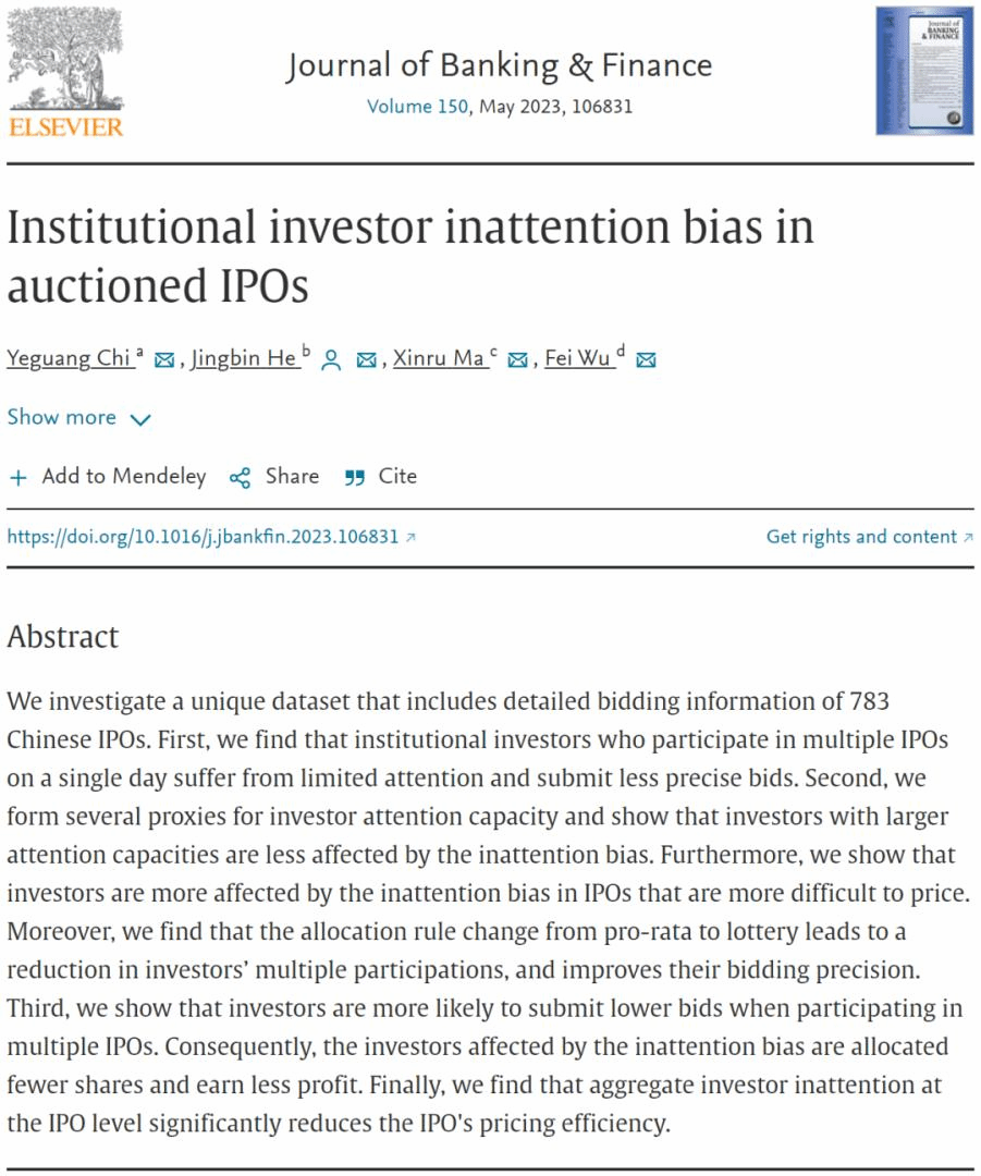日前,金融学院贺镜宾老师(通讯作者)与上海交通大学上海高级金融学院吴飞教授、新西兰奥克兰大学的迟业光老师、四川大学马馨薷老师合作的论文“Institutional investor inattention bias in auctioned IPOs” 在国际著名经济金融类期刊Journal of Banking & Finance在线发表。