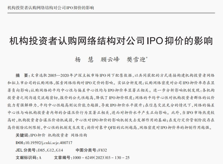 文章选取2005—2020年沪深主板市场IPO网下配售数据,以共同获配的方式连接构建机构投资者网络和拟上市公司的认购网络,探索网络结构对IPO定价的影响。实证分析发现:认购网络密度对公司IPO抑价率存在显著负向影响;认购网络的平均中心性与偏差中心性均与IPO抑价率显著正相关。进一步分析影响机制发现:各机构投资者之间沟通交流越密切,报价的公允性越高,降低了IPO抑价程度;网络的平均中心性对机构投资者群体的议价能力有强解释力,平均中心性越高则议价能力越强,导致IPO抑价水平提升;在信息交流充分的情况下,网络的偏差中心性与响机构投资者内部的合谋压价行为显著正相关,进而对抑价水平产生正向影响。此外,当IPO市场热度较高时,机构投资者合谋压价动机减弱,中心性对IPO抑价的影响机制失去发挥作用的基础;在发行定价管制阶段存在高价剔除比例限制,中心性的机制发生改变;询价对象中QFII的比例越高,网络密度对IPO抑价率的抑制作用越强。